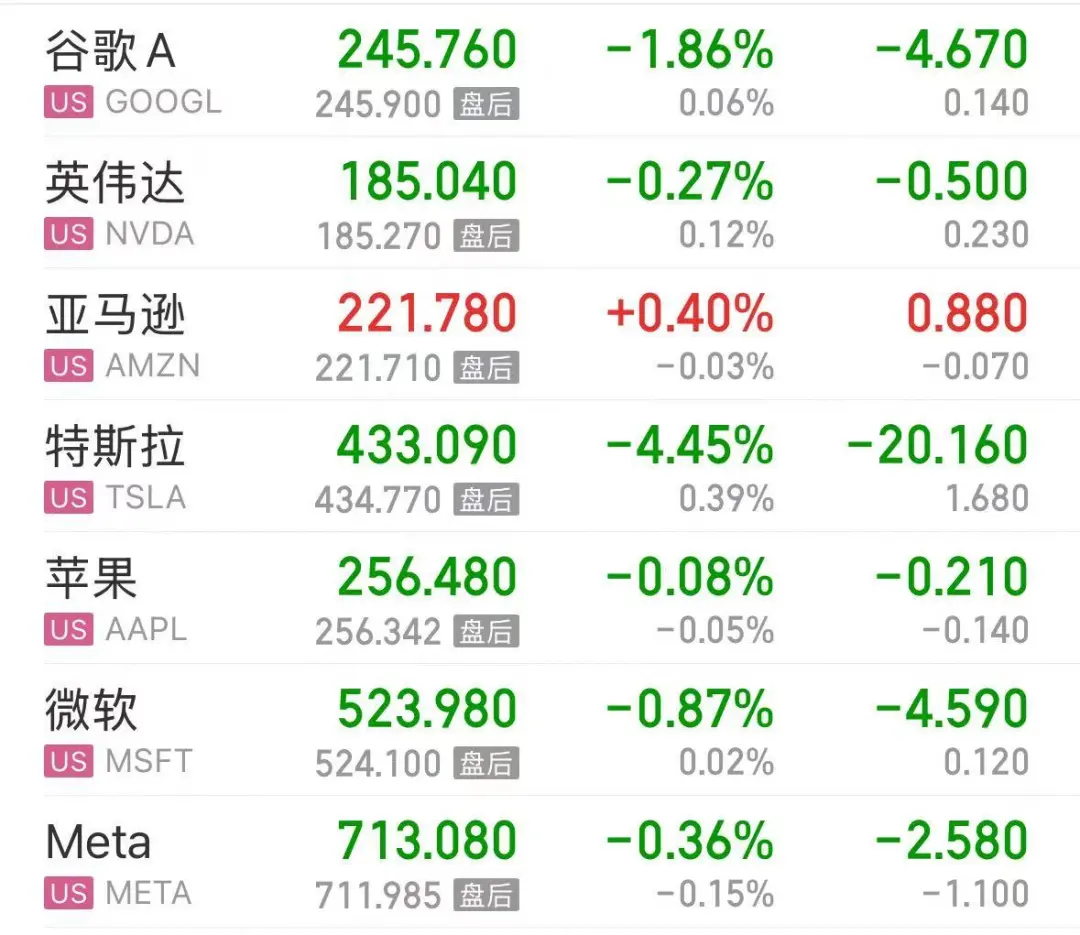 大型科技股多数下跌,特斯拉下跌4.46%,市值蒸发650亿美元(约合人民币4630亿元),谷歌下跌1.86%,英伟达、苹果、微软、Meta微跌,亚马逊上涨。
