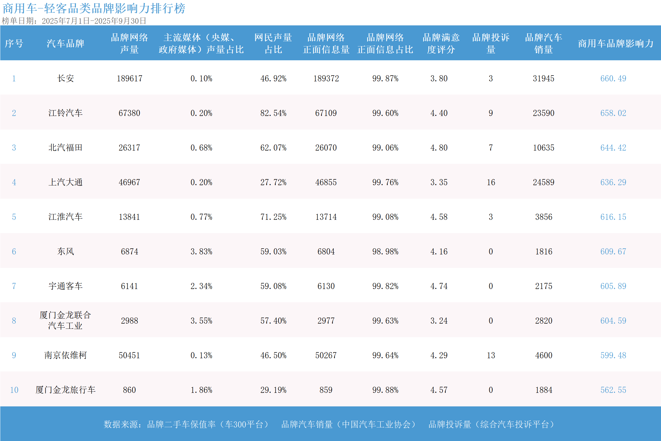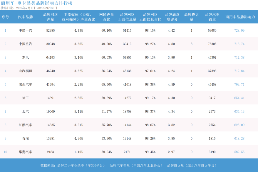 本季度数据进一步验证,在汽车产业变革深化背景下,品牌影响力的提升愈发依赖于传播声量与用户口碑的协同效应。在乘用车领域,问界的崛起完整展示了“技术+生态+口碑”的闭环竞争力。华为乾崑ADS智能驾驶系统与鸿蒙座舱的技术赋能,结合4.50分的满意度评分与仅86件的投诉量,为其声量爆发提供了坚实的口碑基础。这种技术差异化与用户体验的完美结合,为新兴品牌突破市场壁垒提供了成功范本。商用车阵营中,品牌影响力的构建更加强调可靠性与专业性的长期积累。重卡三强凭借主流媒体声量优势与深厚技术积淀持续巩固市场地位。