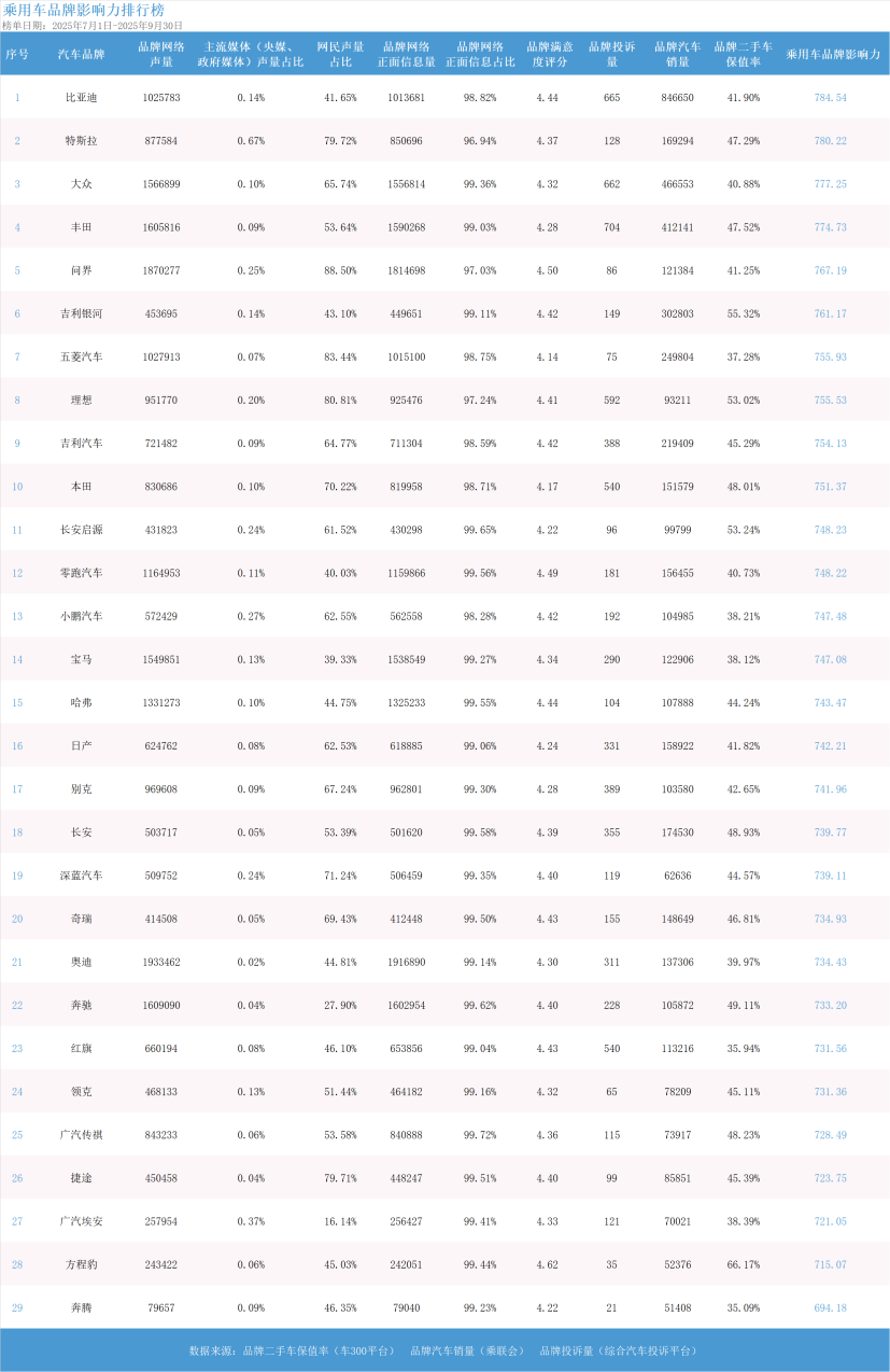 三季度乘用车品牌影响力排名显现出显著的结构性变化,其中,比亚迪以784.54分的综合得分蝉联榜首,其核心竞争力不仅体现在84.67万辆的销量规模,更得益于98.82%的正面信息占比所形成的卓越用户口碑,这种销量与口碑的双重优势彰显出其在新能源领域深厚的技术积淀与市场认可度。