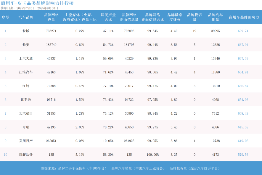 皮卡领域的竞争格局呈现出多元化特征,长城以699.74分保持领先地位;长安以667.94分位列第二;上汽大通则以667.39分排名第三。