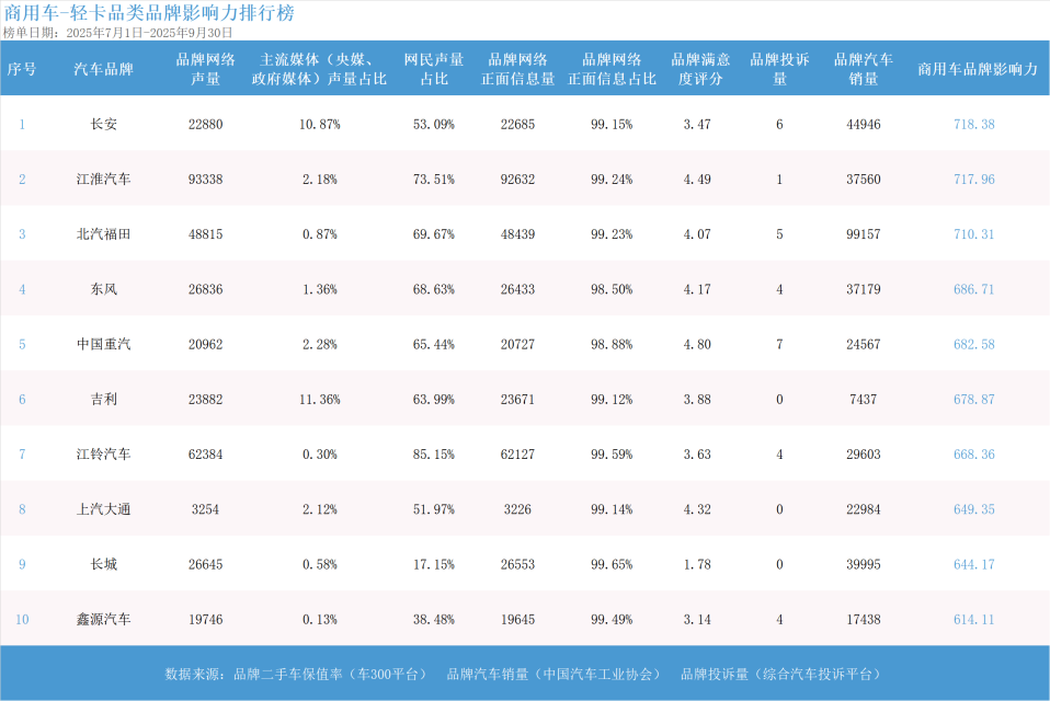 轻卡市场的竞争尤为激烈,长安以718.38分领跑该细分市场;江淮汽车和北汽福田则分位列二三位。